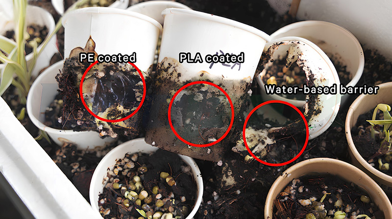 Po 245 dneh se je vodni obložen papirnati pokal popolnoma razgradil, vlakna PLA so bila razgrajena, film PLA se je pokvaril, film PE pa v bistvu nedotaknjen.